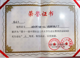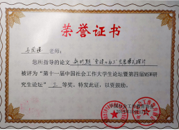 (威廉希尔官网通讯员 李俊) 2019年10月12日—13日,由全国社会工作专业学位研究生教育指导委员会和中国社会工作教育协会主办的第十一届中国社会工作老员工论坛暨第四届MSW研究生论坛在重庆师范大学顺利举行。威廉希尔官网社会学系主任马国瑾带领社工专业16级陈非凡、17级李俊参加论坛,其中陈非凡同学表现突出,在参会论文评选中喜获三等奖。