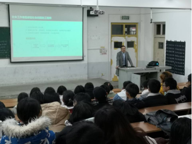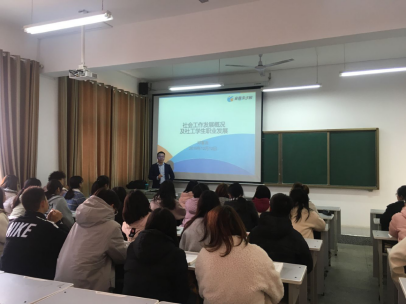 12月12日上午10:00,在南区7栋201,邓富友为18级社工本科生讲授了社会工作领域的发展前景、社会工作人才培养及相关政策法律法规等相关内容。结合自身经历给同学们提出了宝贵的建议。随后,邓富友老师通过播放小视频<<无名之辈·社工版>>,使同学们更生动形象地感受社工的工作技巧和专业魅力。这次分享,充实了同学们专业知识,描绘了社会工作的宏伟蓝图,并指出社会工作者应具备的能力,坚定了选择社工的信心,拓展了学习社工的思路,是一场思想的引导。