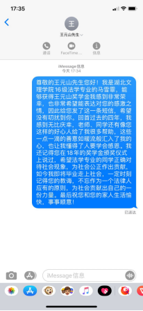 (威廉希尔官网 通讯员 秦春蕾)“亲爱的受奖同学,我收到您的获奖信息和获奖感言,很兴奋,在我余生用秒计算的今后,能通过您所读的公司,可以恵及您刻苦学习,为前辈们助守初心,也算是上下俩代人为国家完善的法律制度,为民族伟大复兴的梦想共同行走在幸福,但也很艰难的征程上,此时,我也由衷的感谢您,给我不多的余生激起更多‘绚丽’的火花,让我的生活更精彩!您将鼓舞我一直向上,向好,向良,向善地走下去!”近日湖北省政协委员、襄阳市政协常委、襄阳市工商联副主席、湖北王胖子置业集团有限公司董事长、襄阳市知名企业家王元山,给获得“王元山奖学金”同学们的回信引起了讨论热潮。