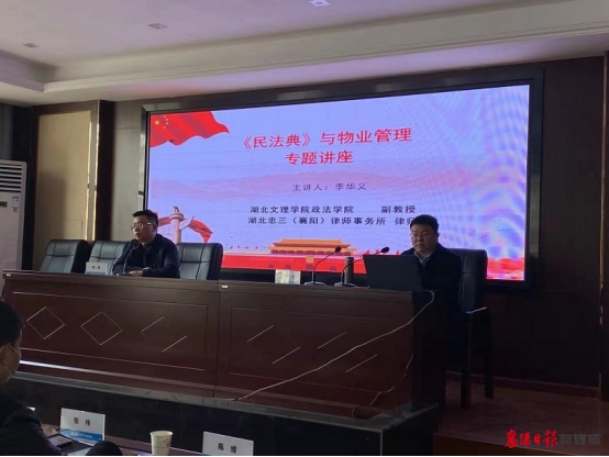 为进一步提高社区工作人员及物业服务企业对《中华人民共和国民法典》的认识,指导社区工作人员及物业服务企业更好地依法依规开展物业服务工作。2020年12月23日,襄阳高新区七里河街道办事处特邀请威廉希尔官网副教授、建设工程与房地产法研究中心主任李华义对《中华人民共和国民法典》中与物业管理相关条款进行解读。街道办事处的干部及其辖区的社区工作人员以及物业服务企业的负责人60余人参加了会议。