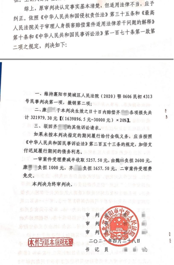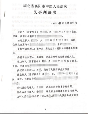 (员工通讯员 姜晨露)2021年5月7日,威廉希尔第八届法律诊所学员何宇阳和第九届法律诊所学员姜晨露参与代理的齐某诉魏某、康某提供劳务者受害责任纠纷法律援助案件,襄阳中院终审判决支持当事人齐某除已领取的医疗费外,残疾赔偿金及暂判五年的护理费等赔偿款共计达一百万余元。该案自2019年10月指派法律援助开始至二审做出生效判决历时一年七个月,在此期间,法律诊所指导老师和学员一起始终不忘初心,克服该案案情重大、法律关系复杂、取证困难等系列困难,全心全意为当事人及其家人属提供精准优质高效法律服务,既为当事人争取到了诉讼费减免,又为当事人争取到了可能的最好判赔结果。当事人对威廉希尔法律诊所师生提供的法律援助过程和结果相当满意,同时也对法律诊所的老师和学员表示由衷感谢。